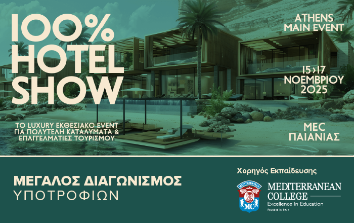 Το Mediterranean College συμμετέχει στο 100% Hotel Show 2025 ως Educational Partner, μια πολυεπίπεδη εκθεσιακή εμπειρία, που στόχο έχει να αναδείξει τις επόμενες κατευθύνσεις τής φιλοξενίας στην Ελλάδα και τη Μεσόγειο. Η παρουσία του 1ου Ιδιωτικού Αγγλόφωνου Κολλεγίου της Ελλάδος, στην εν λόγω έκθεση αναδεικνύει τη δέσμευσή του στην ανάπτυξη καταρτισμένων στελεχών στον τουρισμό και τη φιλοξενία.